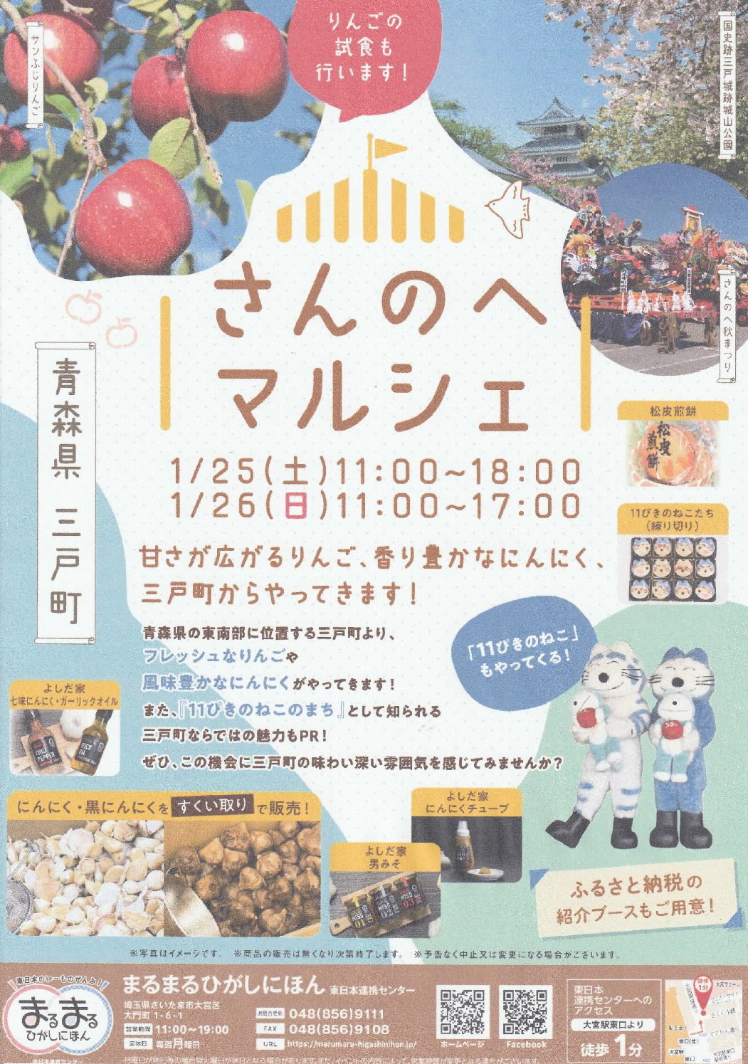 Continue Readingまるまるひがしにほん(大宮区大門町)は1月25日から2日間、青森県の東南部に位置する三戸町からフレッシュなりんごや風味豊かなにんにくなどを販売する「さんのへマルシェ」を開催する。さらに「11ぴきのねこのまち」として知ら […]
