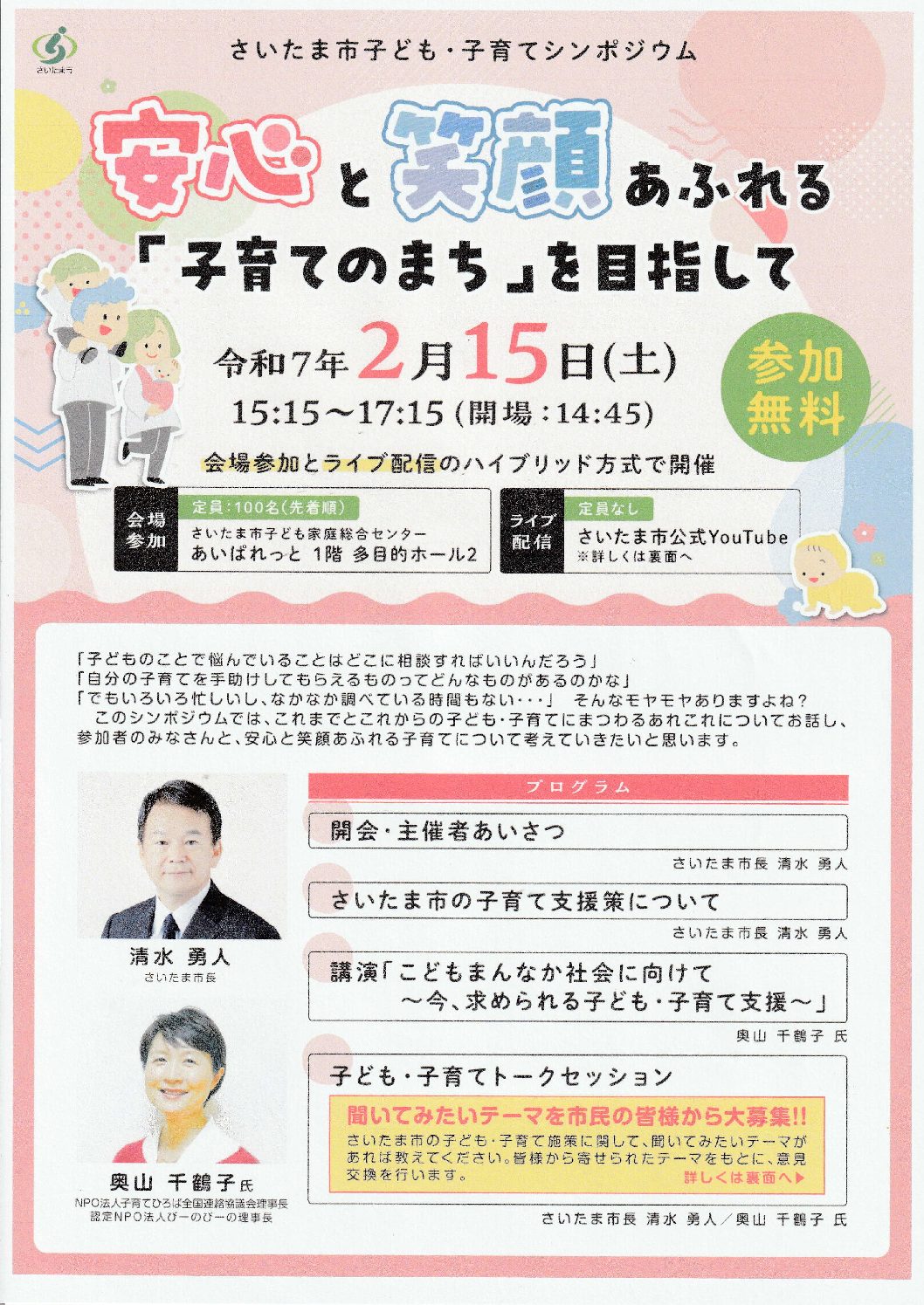 Continue Readingさいたま市は2月15日午後3時15分から5時15分まで、子ども・子育てシンポジウム「安心と笑顔あふれる『子育てのまち』を目指して」を開催する。同市の子ども・子育てに関する現状とこれからの取り組みについて考える。シンポジ […]