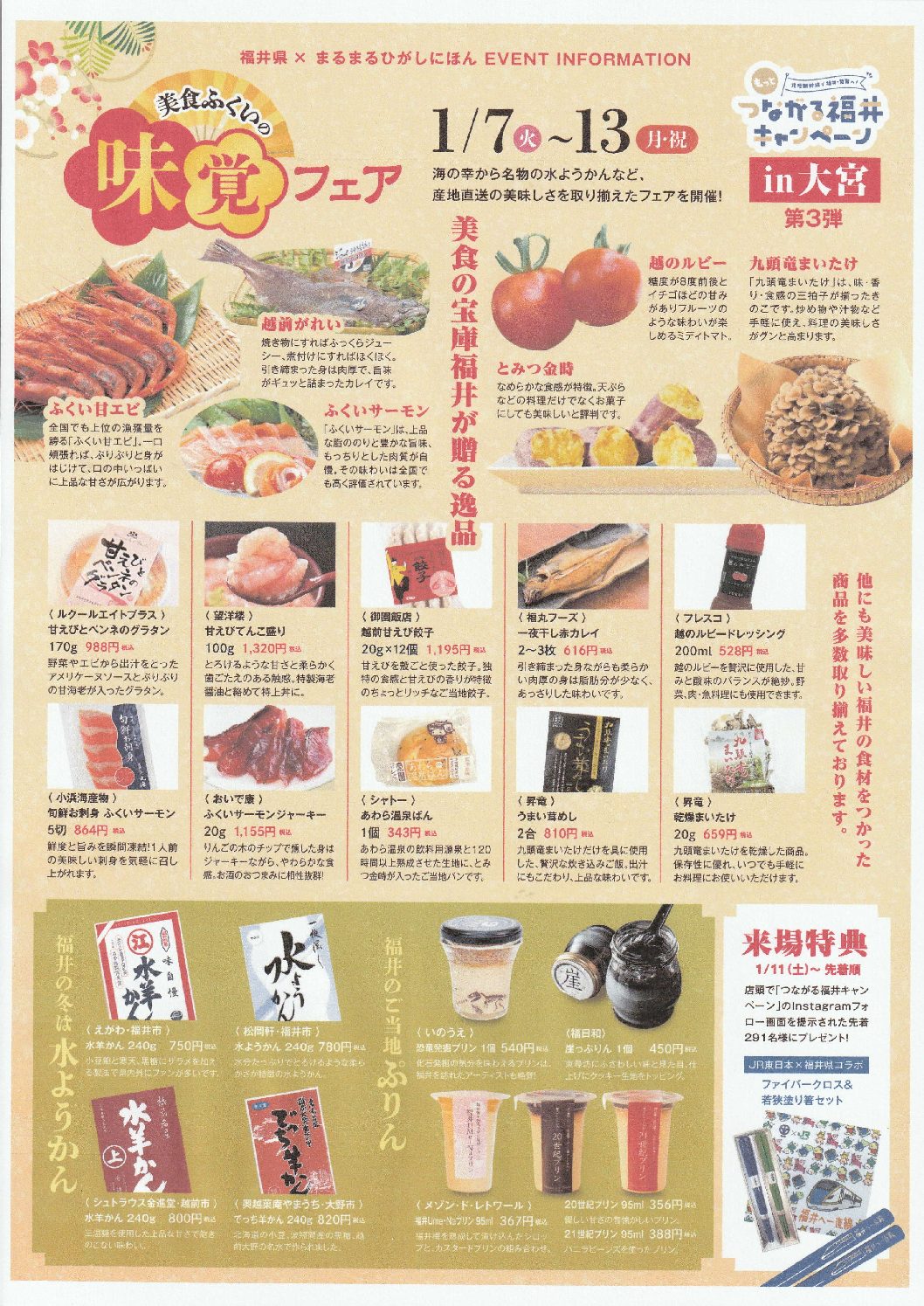 Continue Readingまるまるひがしにほん(大宮区大門町)は1月7日から同13日まで、「美食ふくいの味覚フェア」を開催している。「ふくい甘エビ」「越前がれい」「ふくいサーモン」や「とみつ金時」「九頭竜まいたけ」「越のルビー」などを使った福井 […]